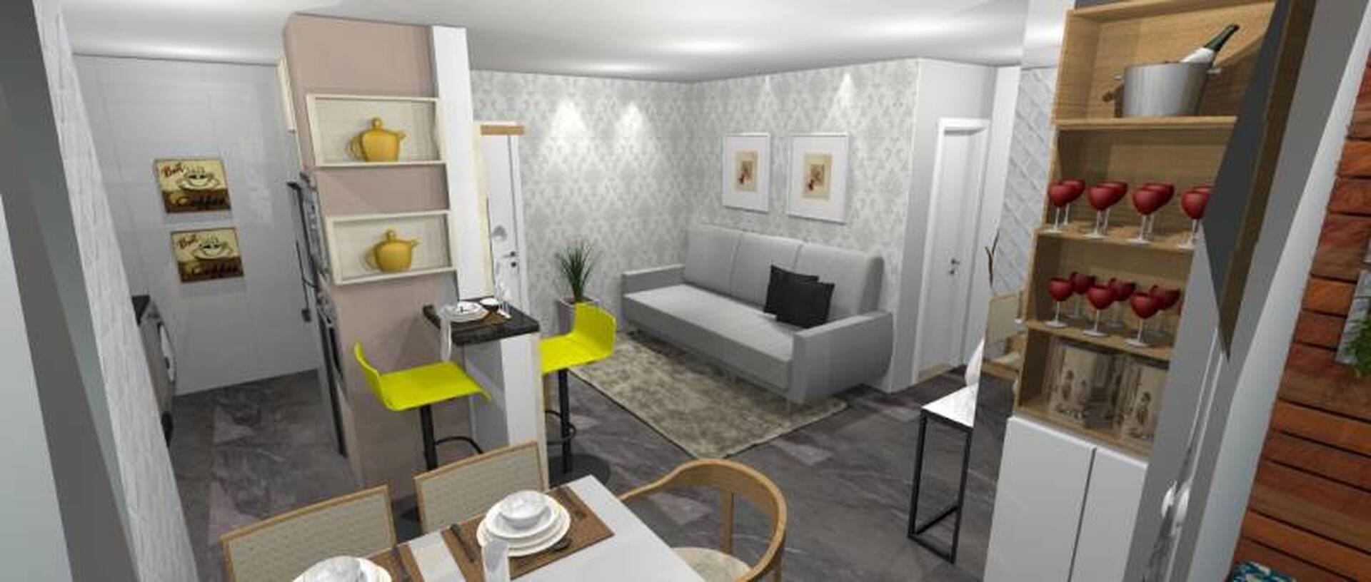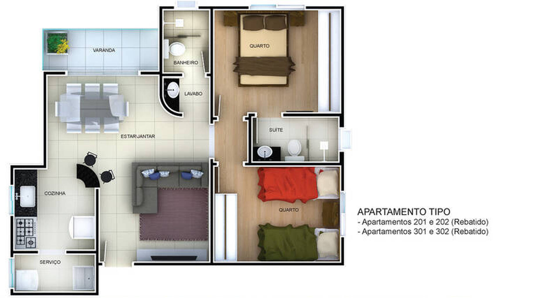 302 ) e 02 coberturas ( Apart. 401 e 402) com 02 vagas de garagem. Todas as unidades possuem sala de estar e jantar integradas com a cozinha ,