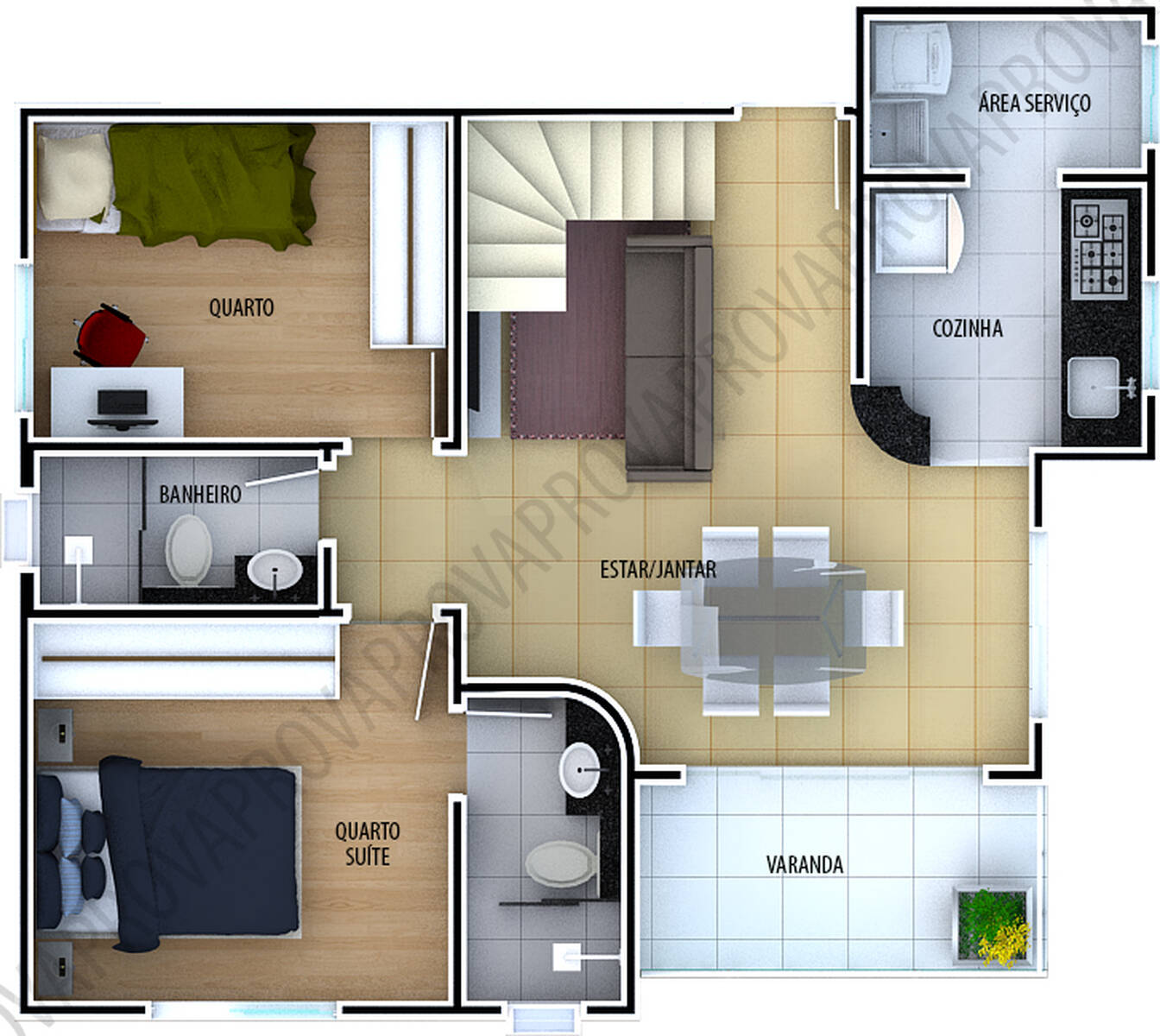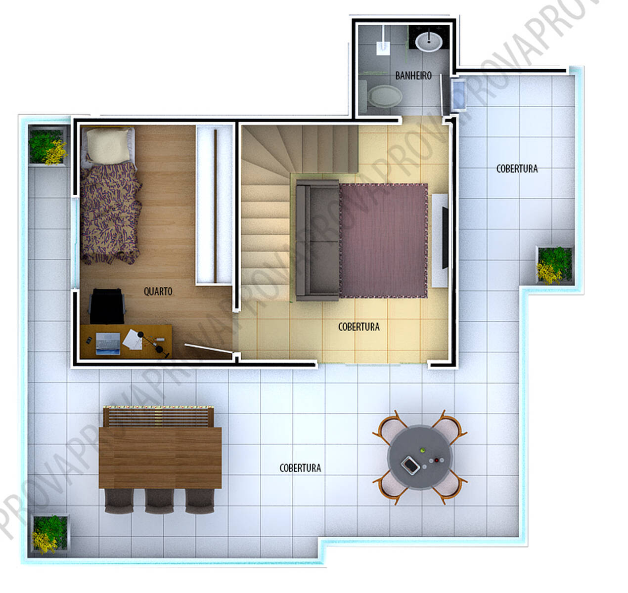 As coberturas possuem no andar superior 01 sala, 01 quarto com banheiro